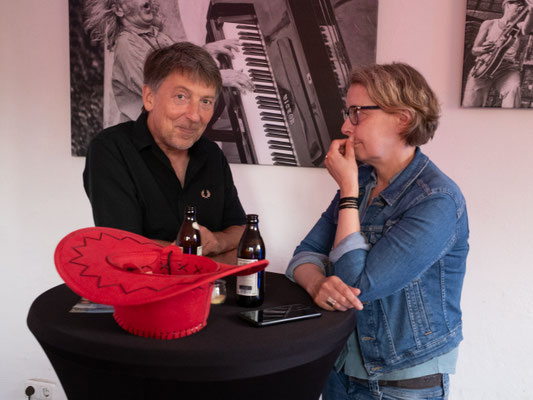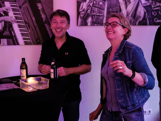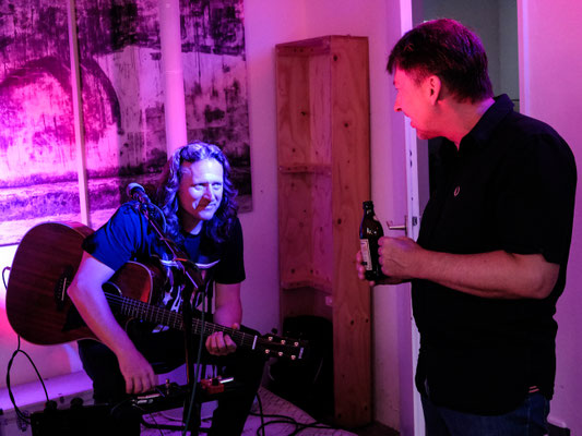 Unser erstes "Neujahrskonzert" mit Sektempfang und Knabber - ein voller Erfolg! Und das lag vor allem an "Familie Hamburg" aus Hannover. Die Vollblutmusiker Fritz und Ste-phanie haben sich auf "Wohnzim-merkonzerte" spezialisiert, lieben den direkten Kontakt zum Publikum, diese intime, familiäre Atmosphäre für ihr Akustiv-Live-Programm. Mit abstrakter Malerei in Acryl verwan-delte Susanne Schwitzer den Kul-Turm dann auch in ein Wohnimmer, in dem sich Musiker wie Gäste pudelwohl fühlten und einen tollen Abend verbrachten. Besonders viel Applaus erhielt die 14jähre Karlotta, Tochter der Hamburgs, die bei zwei Stücken mit wunderschöner Stimme ihre Eltern unterstützte.
